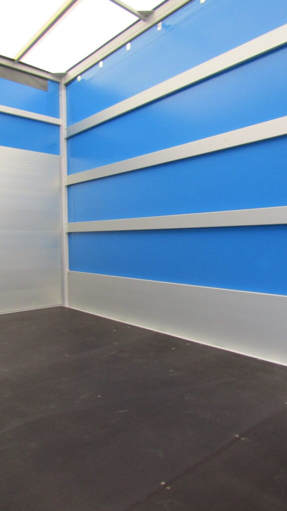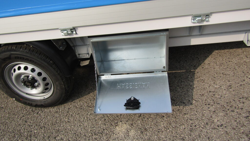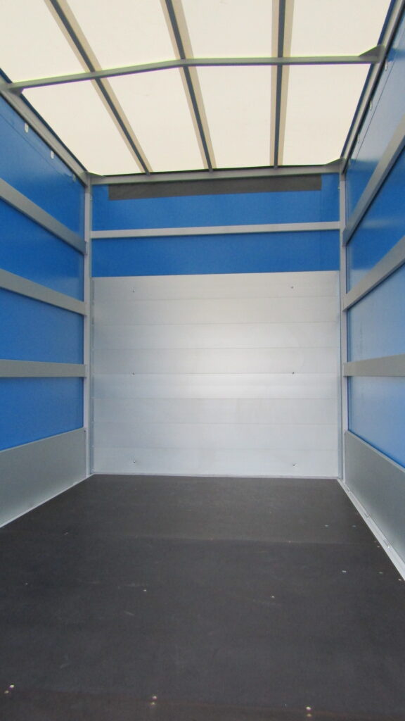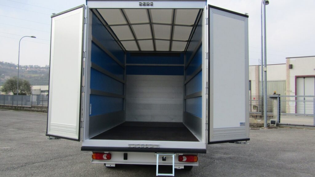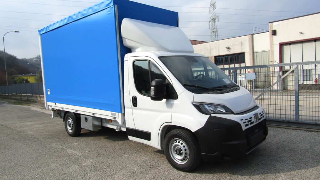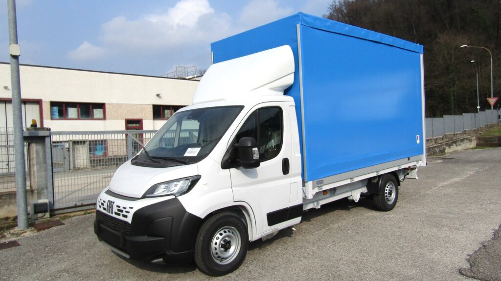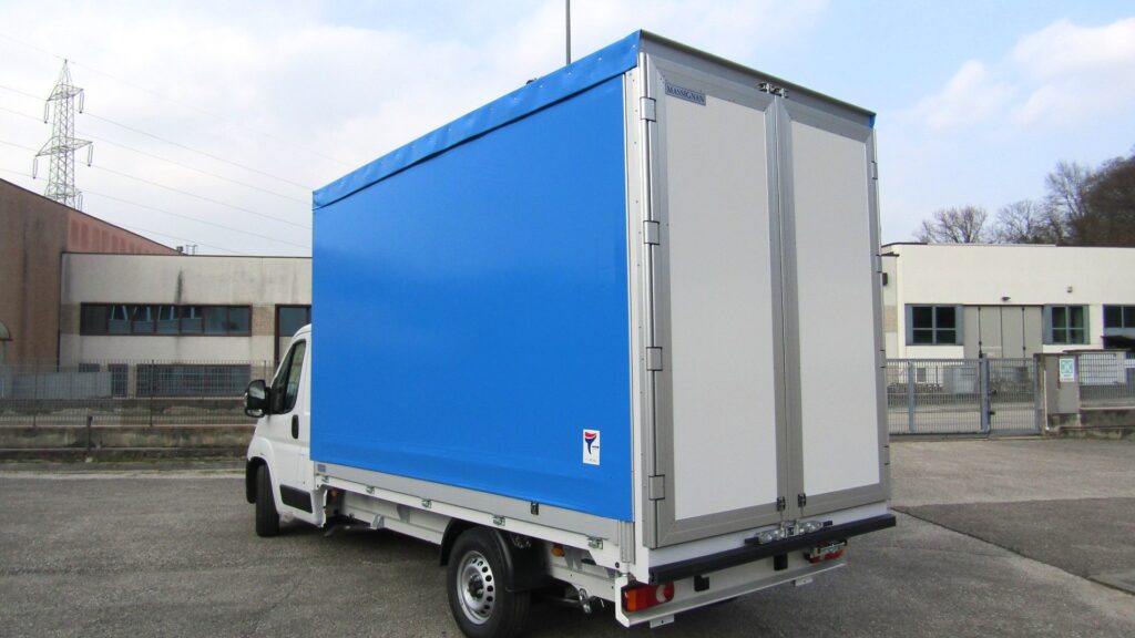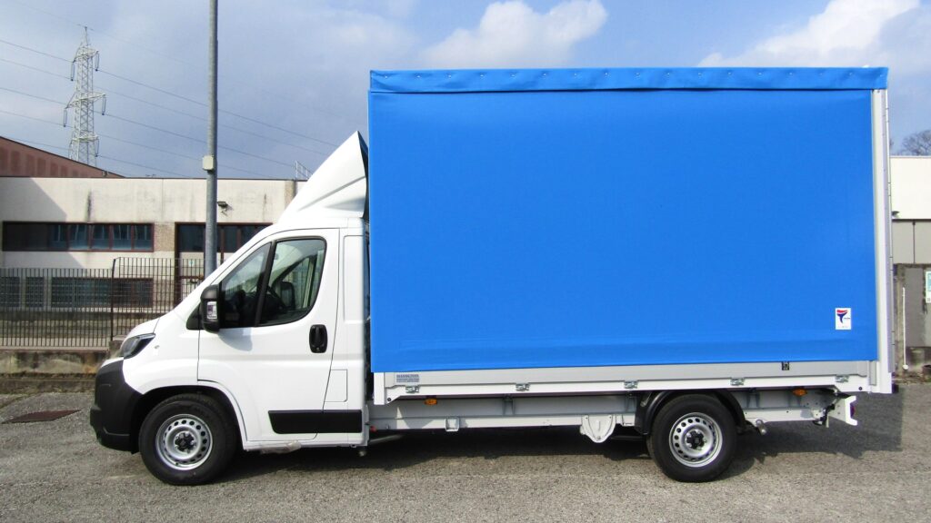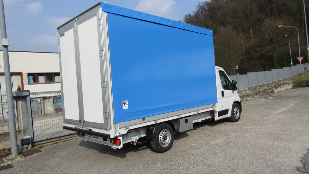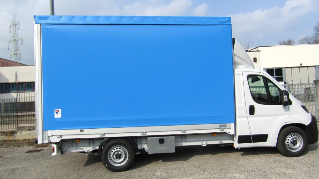 allestito cassone in #ferro verniciato colore #bianco con #CENTINA ad altezza fissa completa di telone colore azzurro, teli laterali scorrevoli, tre giri di liste contenimento carico, un cassetto porta attrezzi zincato, parafanghi posteriori termoplastici e spoiler in vetroresina sul tetto della cabina di guida.
