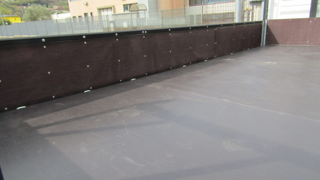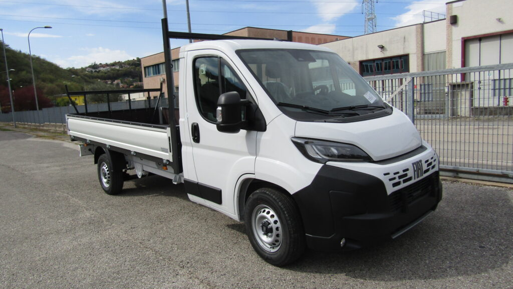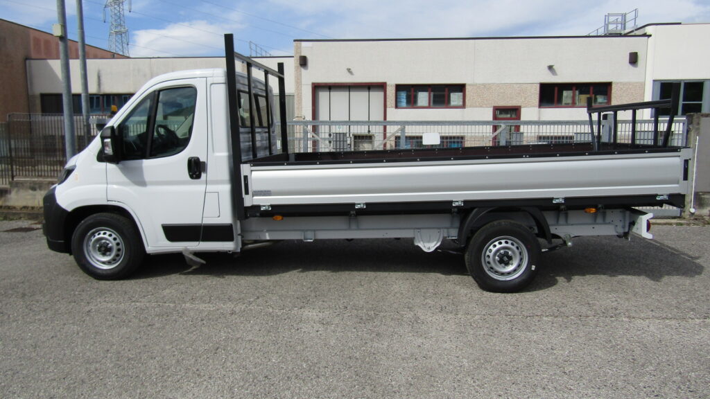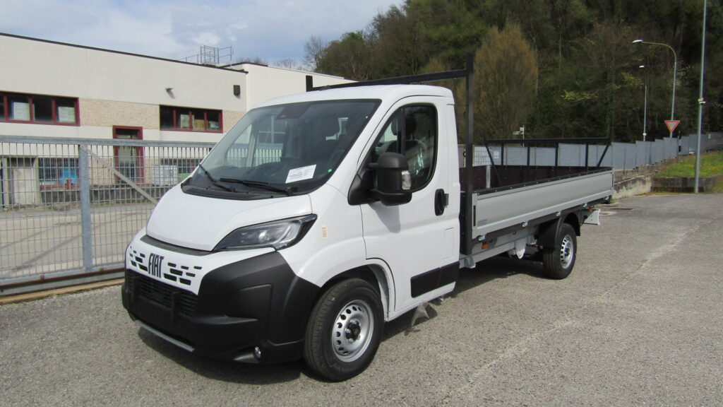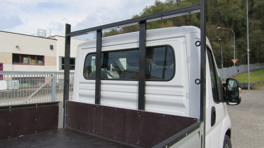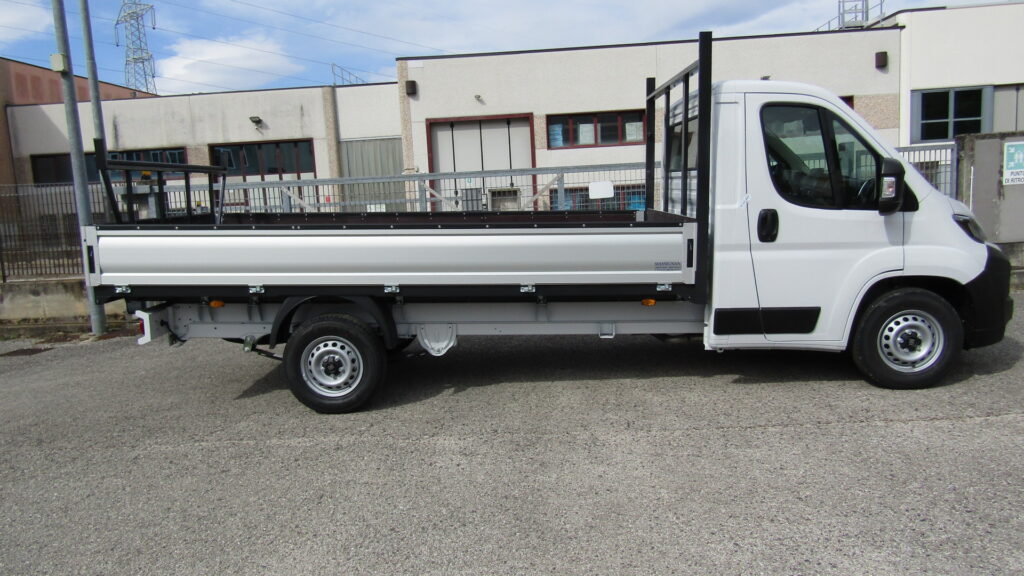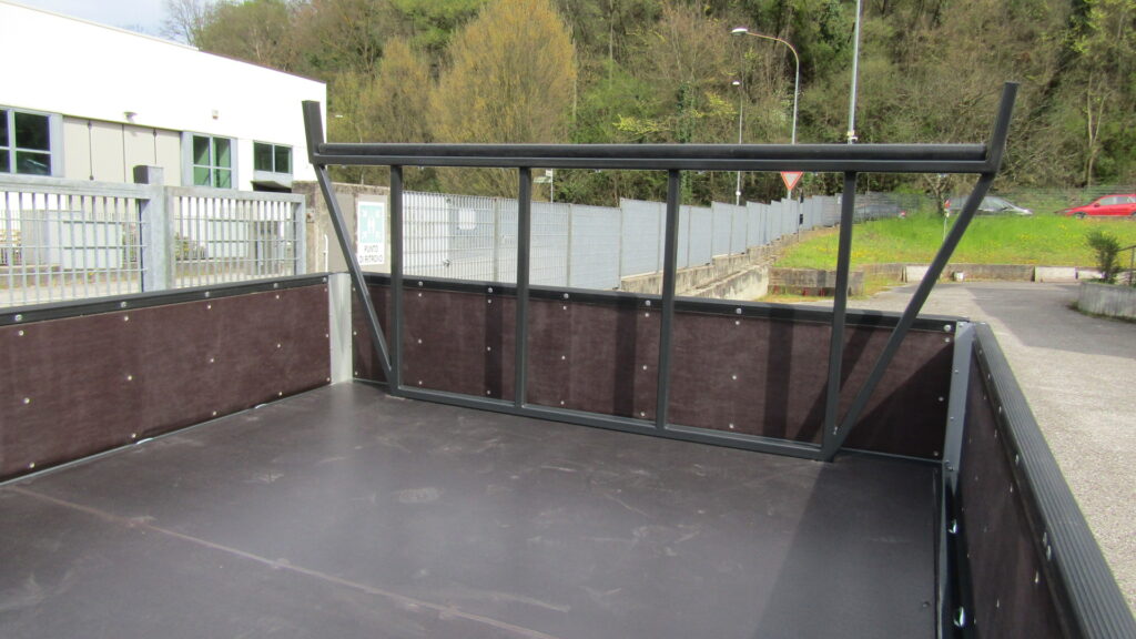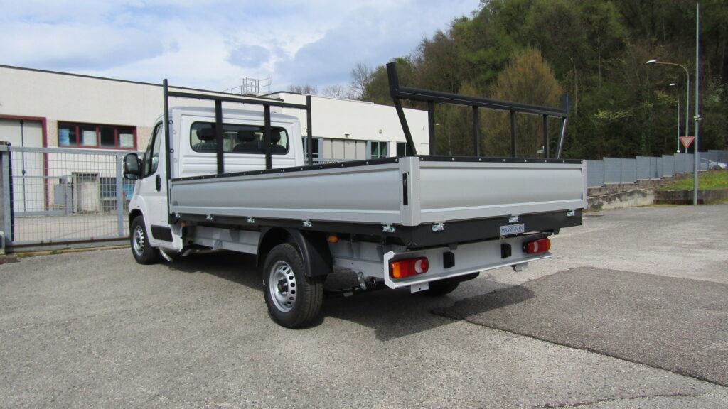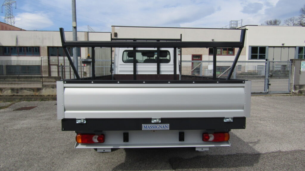 Allestimento con cassone fisso con dimensioni esterne 4200×2100, con sponde in alluminio anodizzato da 400mm dodate di profili in PVC, cavalletta portapali anteriore fissa in ferro con lamiera di rinforzo su montanti laterali, golfari per fissaggio del carico e cavalletta portapali posteriore estraibile.