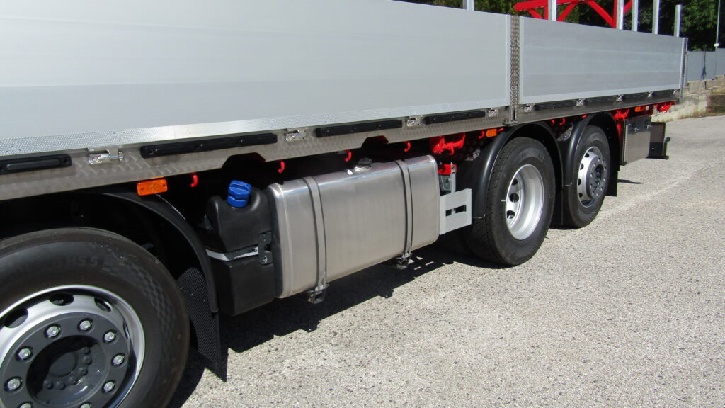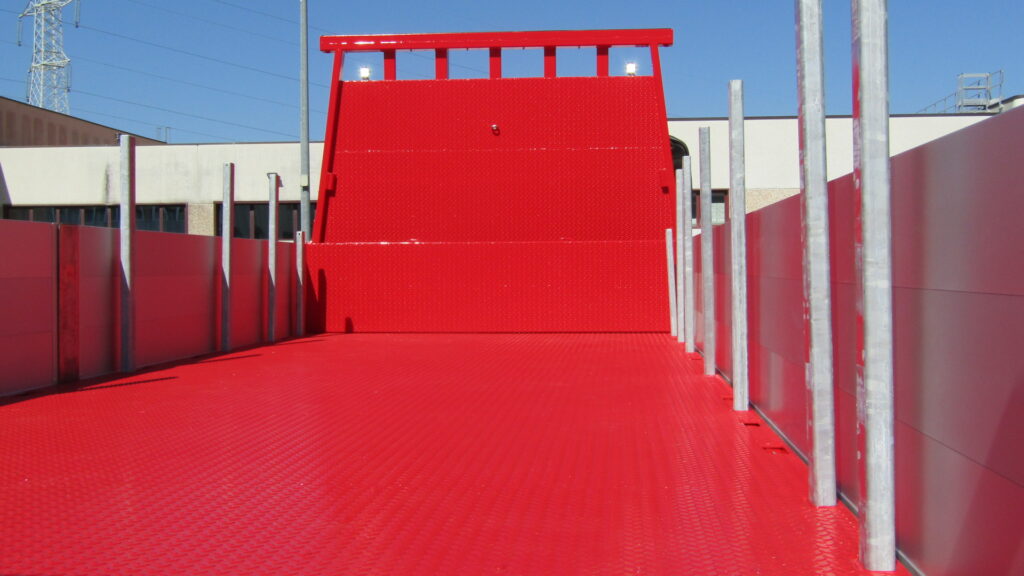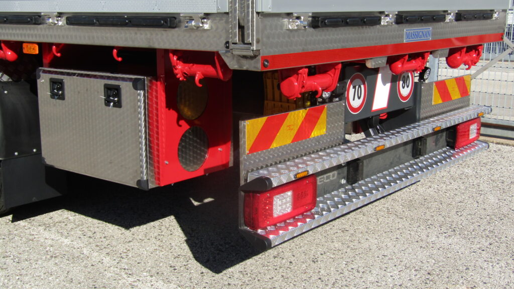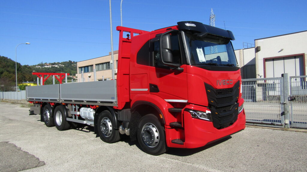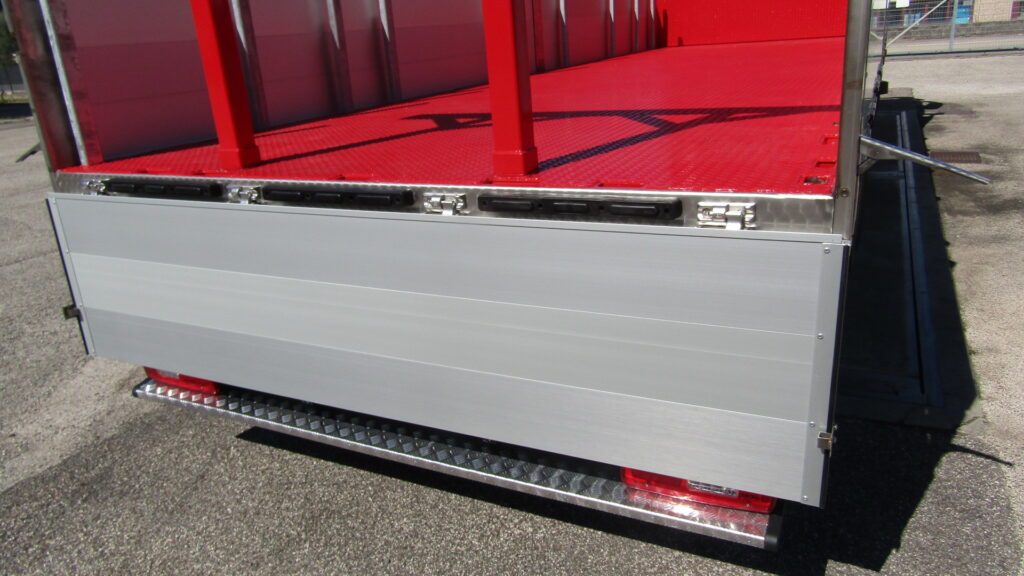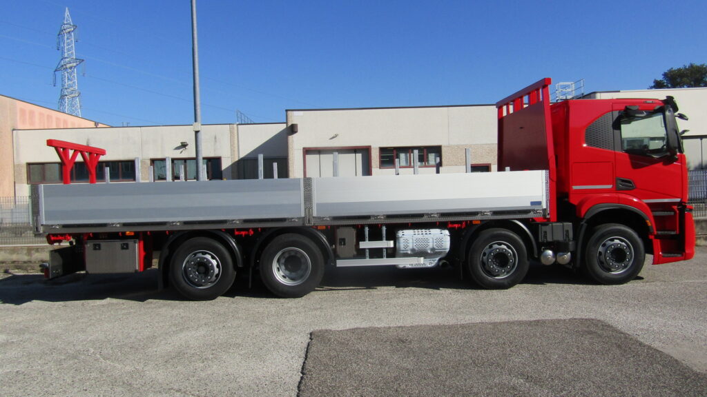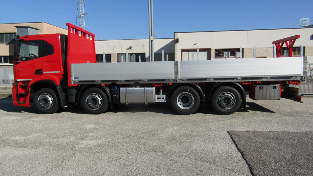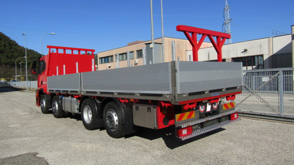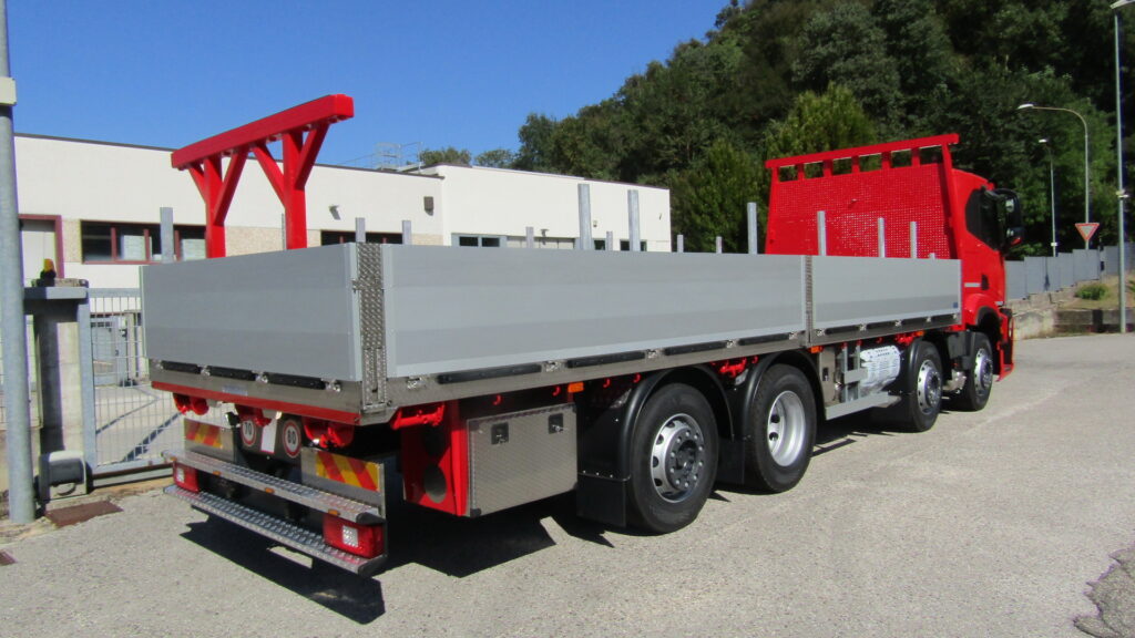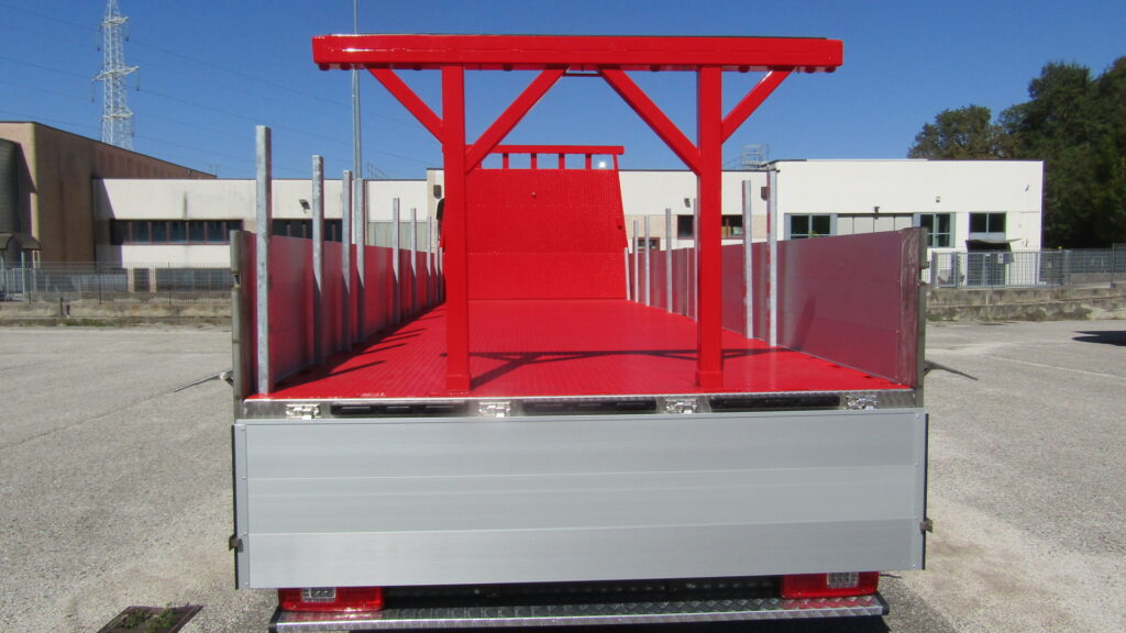Allestimento cassone verniciato colore rosso Maranello, destinato al trasporto di prodotti siderurgici, dotato di cavallette porta pali anteriore e posteriore, piantane a protezione delle sponde laterali e verricelli tendifune per fissaggio del carico.