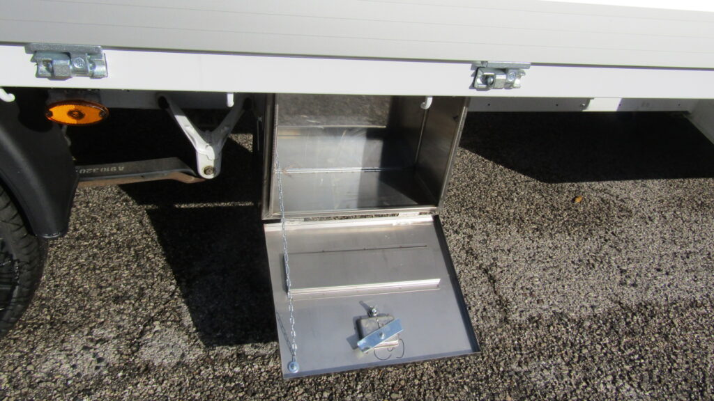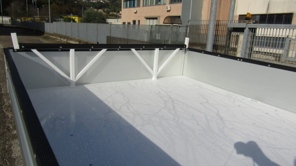 Allestimento con cassone fisso in ferro verniciato di colore bianco, dimensioni esterne 3600×2200, pavimento in lamiera ferro liscia spessore 30/10, sponde in alluminio anodizzato da 400 mm con profilo in gomma.
