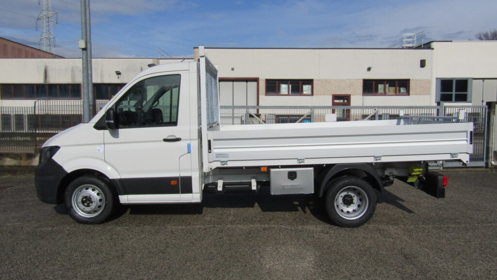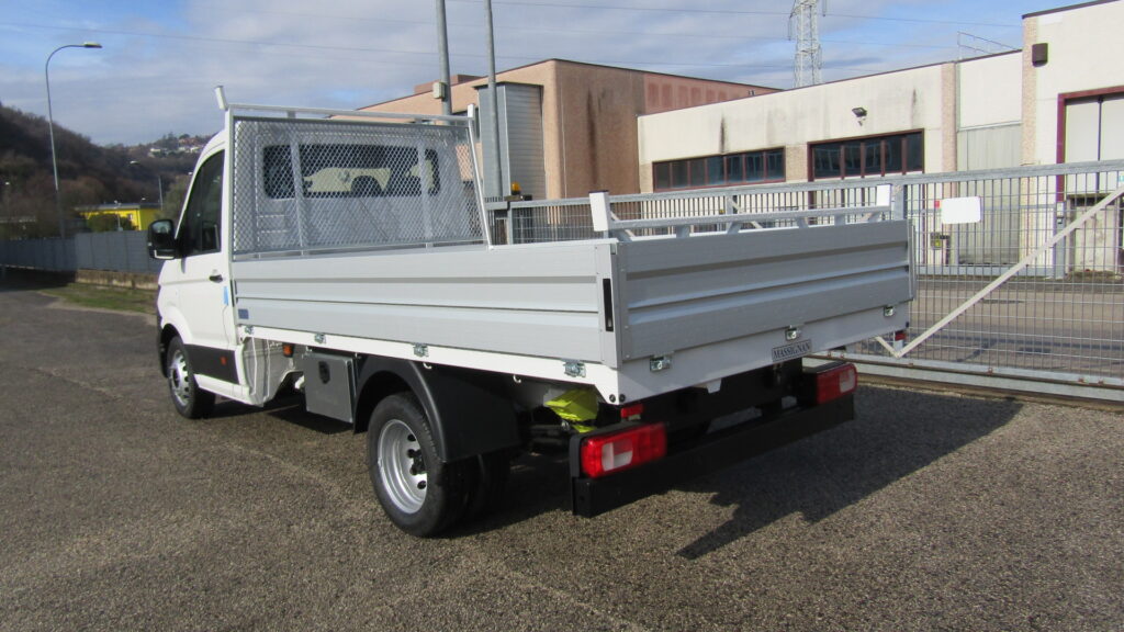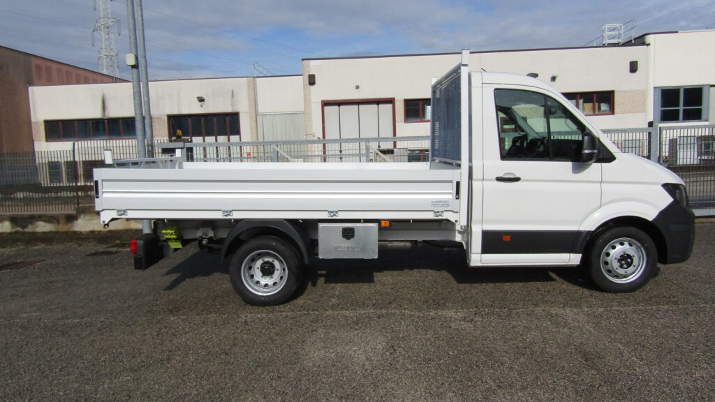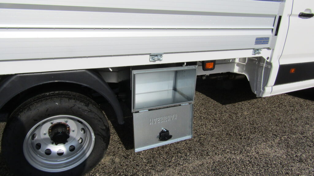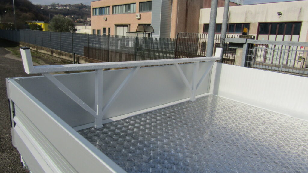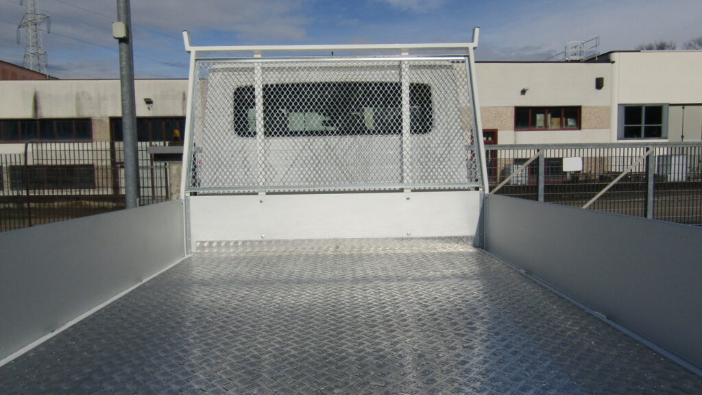 allestito cassone fisso in ferro verniciato colore bianco nella stessa tonalità della cabina di guida, dimensioni esterne 3600×2150, con ganci tendifune laterali, cavalletta portapali anteriore fissa in ferro, dotata di rete zincata e cavalletta posteriore estraibile con l’aggiunta di due cassetti porta attrezzi zincati come da specifica cliente del cliente.